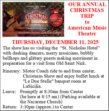 Due to our limited parking, we ask that when you go on one of our trips, please park in the Nazarene Church parking lot. The church has graciously allowed us to park there. This will keep the limited street parking spaces open for folks visiting us during the day.