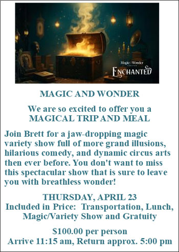 We are able to accommodate foldable walkers and foldable non-motorized wheelchairs. Unfortunately, the bus cannot transport motorized wheelchairs. Everyone needs to be able to navigate several steps entering and exiting the bus. Most trips require the ability to get on and off the bus, and a short walk into the venue and/or restaurant. We will endeavor to include in our description any trip that has excessive walking or obstacles.