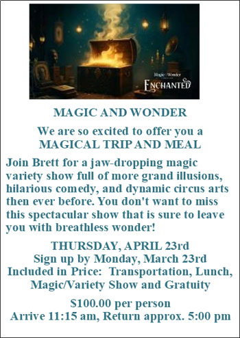 We are able to accommodate foldable walkers and foldable non-motorized wheelchairs. Unfortunately, the bus cannot transport motorized wheelchairs. Everyone needs to be able to navigate several steps entering and exiting the bus. Most trips require the ability to get on and off the bus, and a short walk into the venue and/or restaurant. We will endeavor to include in our description any trip that has excessive walking or obstacles.